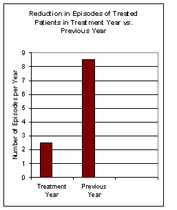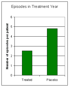 Overall, there was a 2 fold reduction in episodes/patient in treated vs. placebo group in a statistically significant result - an average of 2.52 episodes per treated patient vs 4.8 in the placebo group.
