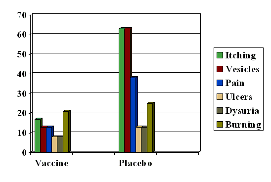 During the first six months after the inoculations, recurrences in the treated group were prevented completely in 37.5% of the patients, whereas in the placebo group, 100% of the patients had at least one recurrence. Treated patients had 50% fewer recurrences and this result was statistically significant. Itching, vesicles, pain, ulcers, painful urination, and burning in the genital area were also reduced significantly.